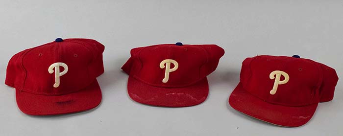 Description:Lot of (10) c.1993 Philadelphia Phillies professional model hats incl. Schilling, Williams, and Fregosi (see description) (EX) Note - These hats are from a noted Phillies collection and were attributed to use in the 1993 World Series. This information can not be substantiated but is passed along. All are done in red with white embroidered team logo and blue button on top. MLB logo embroidered on outside back and "Sports Specialties" size and "The Pro" tags are on interior bands. Jersey numbers written in marker under brim incl. 7 (Mariano Duncan), 11 (Jim Fregosi), 34 (Ben Rivera), 38 (Curt Schilling), 45 (Terry Mulholland), 47 (Larry Anderson), 48 (possibly another number which was gone over below), 50 (Jose DeLeon), 52 (Tim Mauser), and 99 (Mitch Williams). Outstanding usage wear evident throughout: EX