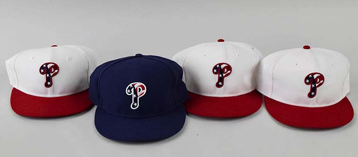 Description:2008 Ryan Howard (attributed) Phillies July 4th Stars n Stripes hat with (3) 2010 hats (notable player attributed incl. Howard and Utley) (EX/MT-NM) Includes 2008 style (blue with red/white/blue logo) with "6" written on inside and (3) 2010 style (red brim, white body, red/white/blue logo) with numbers written under brim in marker incl. 6 (Ryan Howard), 8 (Shane Victorino), and 26 (Chase Utley). Little to no mentionable wear: EX/MT-NM