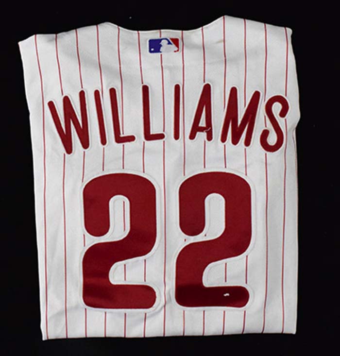 Description:2008 Jimy Williams Philadelphia Phillies professional model home jersey (Coach) (EX) Home pinstriped jersey with "Phillies" lettered across the front has "Williams 22" on back. Number also appears on left sleeve. Majestic tag screened on front tail notes the size (46). Cool Base flag tag on outer seam, interior wash tag is coded 0063 and is with a custom hem tag. Embroidered "08" year tag on front tail. Nice usage wear evident throughout: EX