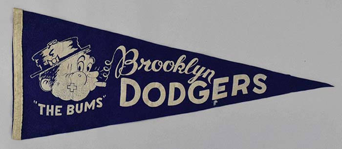 Description:Rare Brooklyn Dodgers "The Bums" pennant c.1940s (VG-EX) Blue felt pennant with screened on titling and graphic display a hint of discoloration to white strip at left edge and a hint of wear. A small hole below "E" in Dodgers is the only substantive flaw: VG-EX ($300-$500)