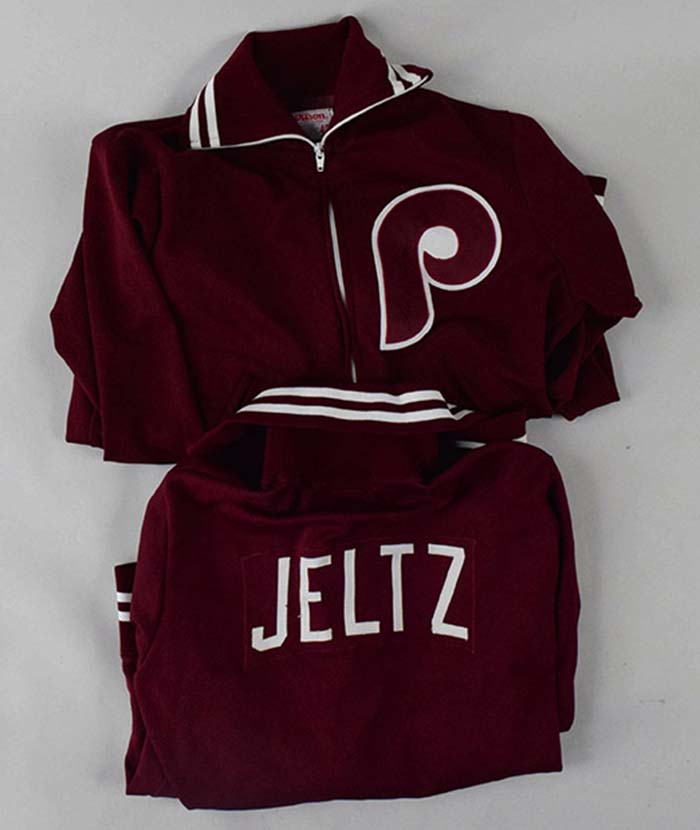 Description:c.1980s Steve Jeltz and Len Matuszek (signed) Philadelphia Phillies professional model warm-up jackets (EX) Pair of maroon zipper front jackets, each displaying the Phillies "P" team logo on front chest with "Wilson" tagging in collar. One (size 40) has "Jeltz" nameplate on back, the other has "Matuszek" (size 42). The later has been signed on front in marker rating 8 out of 10. Evident usage and wash wear: EX