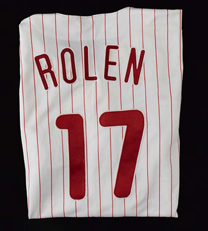 Description:Scott Rolen Philadelphia Phillies professional model home jersey c.1998-99 (EX) Pinstriped home jersey with "Phillies" lettered across the front has "Rolen 17" on back. Number also appears on left sleeve. Russell Athletic manufacturer tag appears on front tail (size 46) with adjacent Polyester tag. Evident useage and wash wear: EX