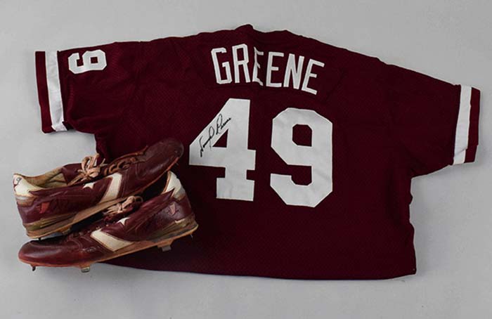 Description:Tommy Greene signed Philadelphia Phillies professional model warm-up top and cleats (EX) Includes maroon Converse brand cleats showing very nice use/wear with toe-guard applied to right shoe. Each is signed in marker rating 8 out of 10. Number "49" written on outer heal of both in marker. Some general age wear and material flaking; maroon mesh jersey with "Phillies" lettered across the front has "49" number on sleeve and back. "Greene" nameplate also appears on back. Rawlings tag is inside noting size (48) (stitching on tag is loose). Signed in marker rating 8 out of 10: EX