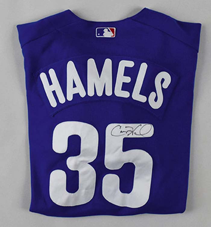 Description:Cole Hamels signed Philadelphia Phillies professional model warm-up or Spring Training jersey (EX) Blue jersey with "Phillies" lettered across the front has number "35" on back below "Hamels" nameplate. Majestic tag is screened on front tail and there is a size "48" flag tag on outer seam. Interior wash tag is coded 0065. Strong useage and wash wear: EX