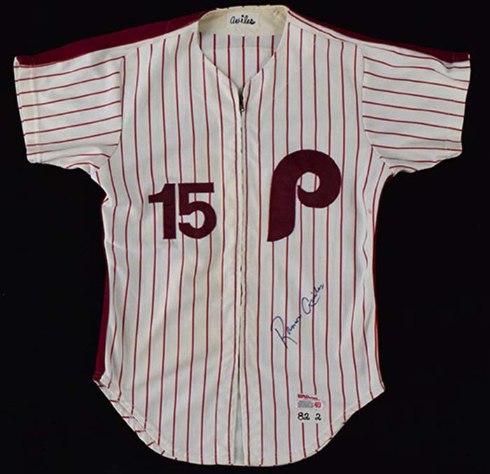 Description:1982 Ramon Aviles signed Philadelphia Phillies professional model home jersey (EX) Pinstriped home jersey has "P" team logo on left front chest and number 15 on right. Number also appears on back below a replaced "Aviles" nameplate. "Aviles" embroidered strip tag is in the collar. Wilson tag on front notes size (40) with additional "82 2" strip tag below. It appears likely that the zipper has been replaced as well. Usage and wash wear throughout: EX