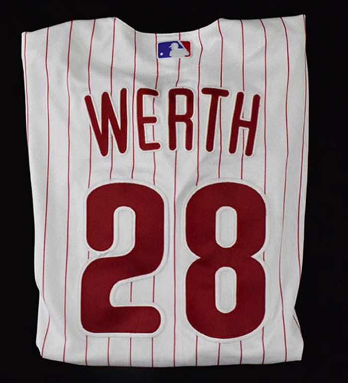 Description:2009 Jayson Werth Philadelphia Phillies professional model home jersey (early season) (EX) Home pinstriped jersey with "Phillies" lettered across the front has "Werth 28" on back. Number also appears on left sleeve; right has 2008 World Series Champions patch. Majestic tag screened on front tail notes the size (50) and Cool Base flag tag is on outer seam. Interior wash tag is coded 0063. Embroidered "09" year tag is on front tail. Very light possible usage wear. A very early season example which did not yet have the memorial patches which were worn: EX