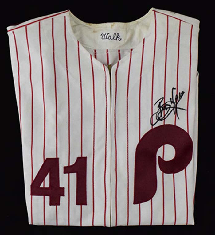 Description:1981 Bob Walk signed Philadelphia Phillies professional model home jersey (EX) Home pinstriped jersey has "P" team logo on left front chest and number "41" on right. Number also appears on back below "Walk" nameplate. Wilson tag on front tail notes size (46). There is a "Walk" embroidered strip tag in the collar and an additional on front tail which reads, "81 1." Signed on the front in marker rating 8 out of 10. Light usage and wash wear: EX