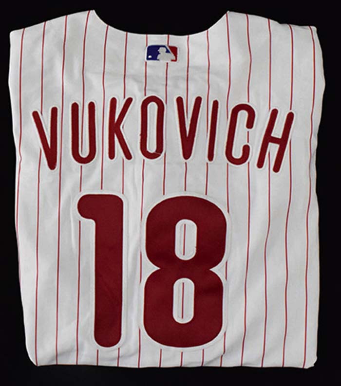 Description:2004 Citizens Bank Park Opening Day John Vokovich Phillies pro model jersey (patches and embroidery) (EX) Pinstriped home jersey has "Phillies" team name lettered across the front and "Vukovich 18" on back. Number also appears on the left sleeve; right has the "Pope Tug" and "2004 Inaugural Season" patches. Majestic tag is on front tail with adjacent size "44" flag tag. 0062 Coded wash tag is inside. the right front tail has been embroidered "Opening Day Citizens Bank Park...April 12, 2004" as were all jerseys used by the team that day. Light evident usage and wash wear: EX
