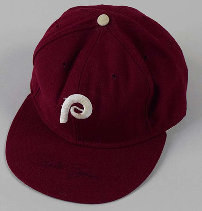 Description:Pete Rose signed c.1980s Philadelphia Phillies professional model hat (EX) Maroon hat with embroidered "P" logo has white button accent on top. "Wilson Professional Cap" inside notes size, "7 3/8." The number "14" is written in small numbers under the brim. Rose has signed the top of the brim in marker rating 7-7/8 out of 10. Evident usage wear throughout: EX