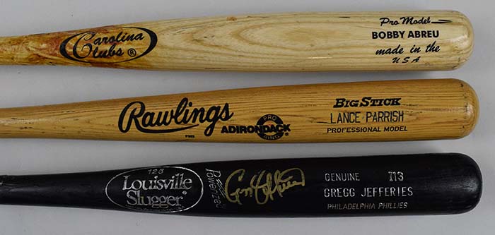 Description:Lot of (10) Philadelphia Phillies professional model bats c.1980s-2000s (some signed) incl. Parrish, Abreu, and Jefferies (Overall EX) Includes Lance Parrish Rawlings BigStick light use and rack streaks; Bobby Abreu Carolina Clubs with nice use and heavy handle crack. Number has been written on either end in marker; Gregg Jeffries Louisville Slugger with handle crack that has been glued. Original handle tape remains in place and the number "25" is written on knob. Signed in gold marker rating 8 out of 10; (2) David Bell Louisville Slugger. One has MLB Authentication hologram affixed and is severely cracked. The other has a light crack and is signed in marker rating 8 out of 10; Michael Martinez Louisville Slugger which has a handle crack and has been signed in marker rating 8/9 out of 10. MLB Authentication hologram; Brian Schneider Marucci with handle crack and MLB Authentication hologram; Wilson Valdez Marucci with handle crack and MLB Authentication hologram; Miguel Cairo Rawlings BigStick with severe handle crack and MLB Authentication hologram; Ricky Battalico Louisville Slugger with handle crack. Varying degrees of use/wear throughout: Overall EX