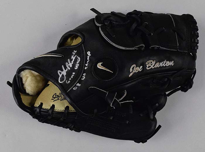 Description:Joe Blanton signed "game used" professional model baseball glove (EX) Black leather Nike model "PPRO Gold 1175" glove has "Joe Blanton" name embroidered along outer thumb. Nice use/wear evident throughout and it has been signed "Joe Blanton" in silver marker and inscribed "Game Used 08 WS Champ." Signature rates 7/8 out of 10: EX