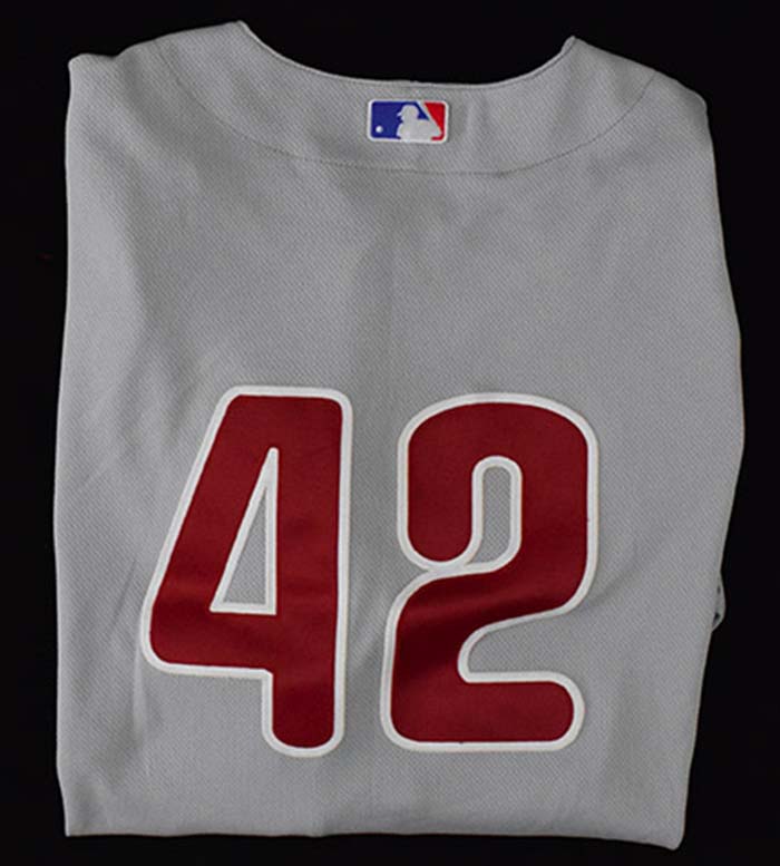 Description:May 16, 2009 Jayson Werth Jackie Robinson Day game used Philadelphia Phillies road jersey (MLB Auth) (EX) Road gray jersey with Phillies team name lettered across the front has number "42" on back. An "HK" memorial patch appears on chest in honor of Harry Kalas. Screened on Majestic tag lists the size (50) and player number "28" is written on in black marker. Affixed MLB Authentication hologram confirms use in the game played in Washington: EX