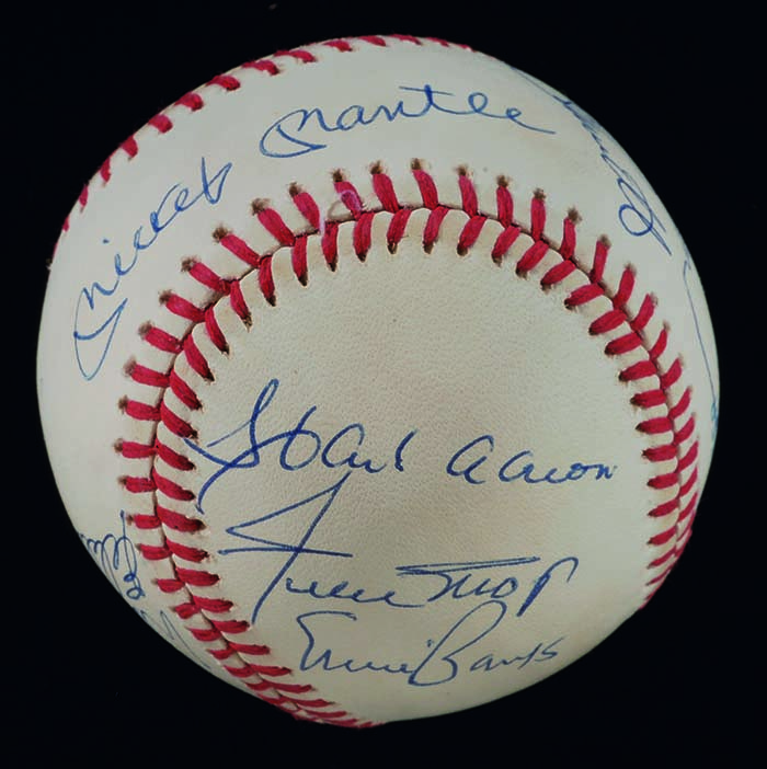 Description:500 Home Run Club autographed baseball - (10) signatures incl. Mickey Mantle (NM) Rawlings B.Brown Official American League baseball has been signed by (10) incl. Mantle, Aaron, Mays, Banks, McCovey, Mathews, Jackson, Killebrew, Schmidt, and Robinson. Blue ink signatures rate 8 to 8/9 out of 10. Ball has some extremely minor imperfections noted for accuracy: NM ($500-$750)