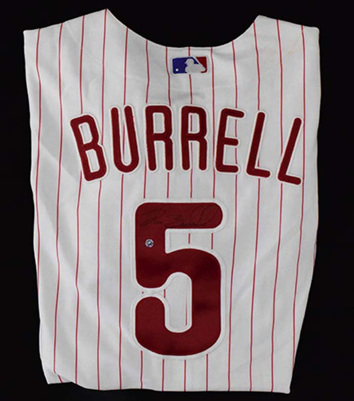 Description:April 18, 2006 Pat Burrell signed game used Philadelphia Phillies home jersey - home run game (MLB Auth) (EX) Home pinstriped jersey with "Phillies" lettered across the front has "Burrell 5" on back. Number also appears on left sleeve. Majestic tag appears on front tail with adjacent size (48) flag tag. Interior wash tag is coded 0062. Signed on the back number in marker rating 8 out of 10. Strong usage wear evident throughout with affixed MLB Authentication hologram: EX