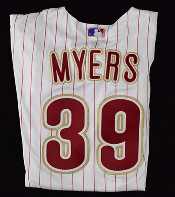 Description:Rare style April 5, 2009 Brett Myers Philadelphia Phillies game used home jersey (MLB Auth) (EX) Pinstriped home jersey with "Phillies" lettered across the front has "Myers 39" on back. Number also appears on the left sleeve. All are done in special gold edged lettering as worn only for this (1) game. A World Series Champions patch on left sleeve is similarly accented. Majestic tag screened on front tail notes size (54) and there is a Cool Base flag tag on outer seam. Properly coded wash tag and custum hem tags are inside. Affixed MLB Authentication hologram confirms use: EX