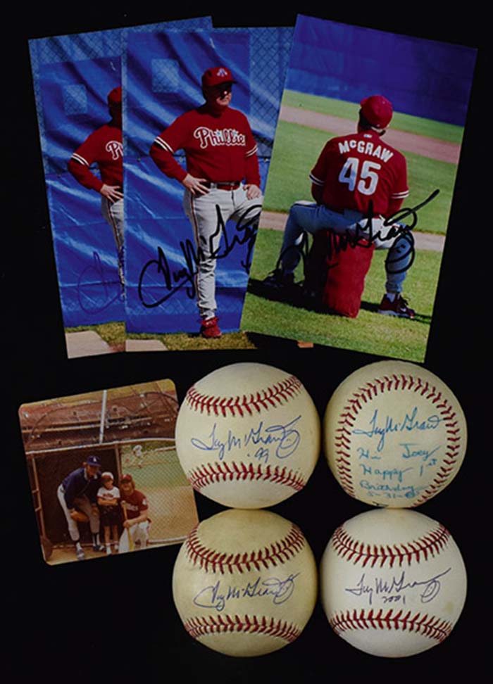 Description:Lot of (9) Tug McGraw autographs incl. (4) single signed balls (EX-NM) Includes vintage snapshot photo (just under 3.5"x3.5") which has been signed by McGraw in ink rating 6/7 out of 10 along with (8) additional snapshots taken around Vet Stadium; Rawlings Official 1980 World Series logo baseball which has been signed and dated 1999 in ink rating 8/9 out of 10. Ball has some mild toning and a few other flaws; Rawlings L.Coleman ONL ball signed in ink rating 8 out of 10 (ball shows use/wear with soiling throughout); Rawlings B.Selig OML ball signed on the sweetspot and dated 2001 (hint of very minor toning/wear); Wilson brand ball signed on the side panel, "Tug McGraw" in ink rating 7/8 out of 10. Inscribed below in unknown hand (likely not McGraw), "Hi Joey Happy 1st Birthday 5-31-85." Touch of light toning; (3) signed 4"x7" color photos, all done in marker rating 8 out of 10; McGraw signed print of a tug boat; and several other McGraw related pieces: EX-NM