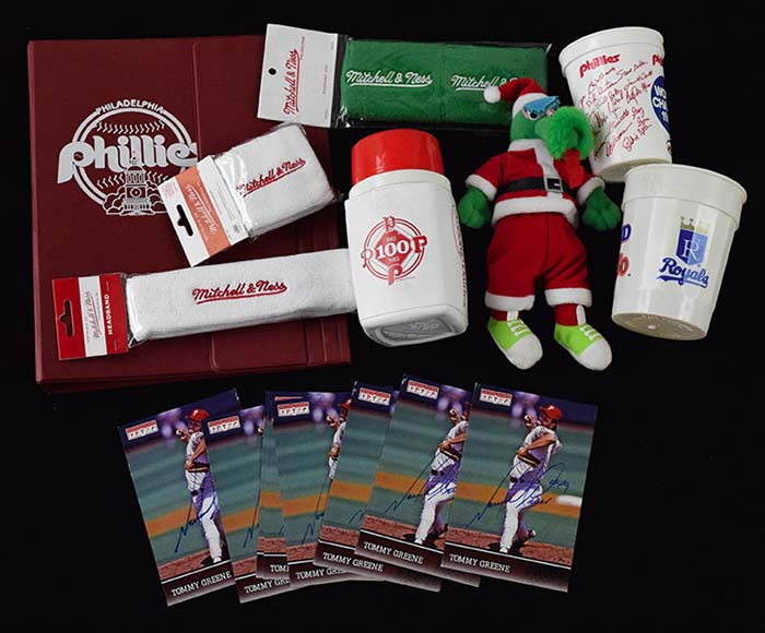 Description:Nice lot of Phillies display pieces incl. vintage with Robert autographed piece, 1950 Inquirer set, etc (FR-NM) Includes 1950 Phillies Philadelphia Inquirer newsprint set of photos/premiums which remain uncut in their original pages (pages have varying degrees of wear/chippings at corners/edges); Puddin Head Jones sheet music; framed display which has (9) trimmed 1951 Bowman cards of Phillies players incl. Waitkus, Seminick, Hamner, and others; Robin Roberts signed 1954 Phillies insert from Philadelphia Inquirer (some toning/small tears - mounted to 17"x24" backing); Del Ennis signed Adirondack bat ad; exceptional 11"x14" photo of Robin Roberts and Eddie Sawyer seated in locker room (high quality modern print); modern print of 16"x20" 1950 Phillies team photo and a second which is framed to slightly larger dimensions for display; photos of Dick Allen and (2) of another Phillies player in 1939; modern Shibe Park commemorative print; vintage scrapbook filled with clippings related to the 1954 Phillies and A's; 1950 Sporting News issue with Phillies illustrated on cover; 1964 Jim Bunning Perfect Game newspapers; (2) 16"x20" black and white photos of 1950s era Phillies players one of which includes Robin Roberts (this photo is framed with a small chip in corner of glass); 8"x10" photo of some Phillies players; pair of vintage Phillies related newspaper clippings; 1898 newspaper clipping with illustration of ball players whom are presumably Phillies/Philadelphia area (creasing/chipping); framed 1950 newspaper page with Phillies/Yankees content; matted oversized Chesterfield ads featuring Robin Roberts and Gran Hamner; additional matted page which is from 1950s newspaper with Phillies sending thanks to fans (tear in front); (2) large 1950 World Series displays made from vintage newspaper clippings/pages which are mounted in 20"x28" frames. Varying degrees of wear throughout (please note - newsprint pieces will likely have more pronounced wear): FR-NM
