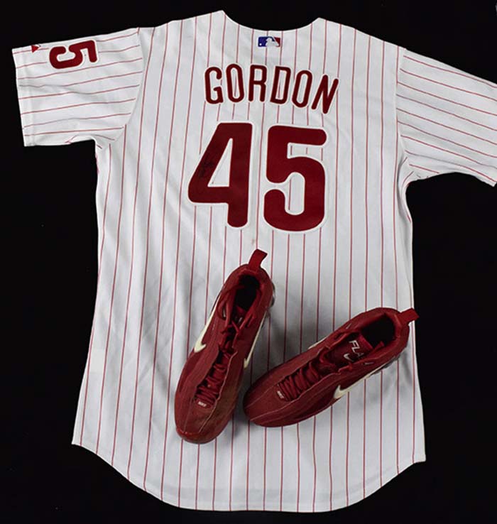 Description:2006 Tom Gordon signed Philadelphia Phillies professional model home jersey and "Flash" embroidered cleats (EX) Pinstriped home jersey has "Phillies" team name lettered across the front and " Gordon 45" on back. Number also appears on left sleeve. Majestic tag on front tail has adjacent size (46) flag tag. Properly coded wash tag is inside. Signed on the back number in marker rating 8 out of 10 with light use evident throughout; Nike brand cleats with each have "Flash" embroidered on tongue. Nice use with toe area of right foot coated in protective rubber: EX