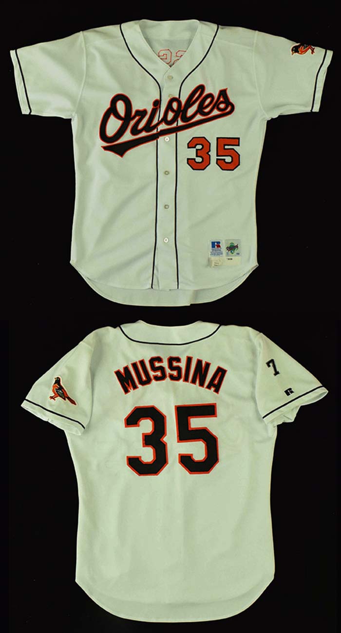 Description:1999 Mike Mussina Baltimore Orioles professional model home jersey (EX) White home jersey has "Orioles" lettered across the front with number "35" below. Number also appears on back below the name, "Mussina." Team logo patch appears on the left sleeve, black number "7" worn in honor of Cal Ripken Sr. is on right. Russell Athletic tag on front tail notes the size (46) and a "1999" printed strip tag is below. Also present are a pair of custom hem tags and the 100% Polyester tag. Nice usage and wash wear evident throughout: EX ($400-$600)