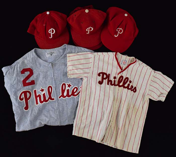 Description:c.1950s Phillies child and 1970s adult sized uniforms with (4) vintage hats (Overall EX) Includes c.1950s child size pinstriped jersey and pants done in Phillies style has team name across the front of the jersey and number "1" on back. Empire manufacturers tag on jersey. Includes stirrup socks; gray flannel zipper front jersey with "Phillies" lettered across the front and number "2" on right front chest. Number also appears on the back. Aladen manufacturers tag in the collar and there are wash and size (40) tags at lower front. Matching pants have similar wash and size tags (size 34). Uniform shows use/wear. Of unknown origin but possibly created for use at an Old-Timers event; selection of (4) vintage c.1970s-80s Phillies hats which generally appear to have been manufactured by or of higher quality than what was have been available for retail purchase. It is likely that some, if not all, were made for use at Old-Timers or other team related functions. Makers incl. Wilson, Cooperstown Ball Cap, Annco, and one which only has Cooperstown Collection tag; total of (5) stirrup socks which each have a number written on in marker (#s 19, 24, 25, 35). Varying degrees of wear throughout: Overall EX