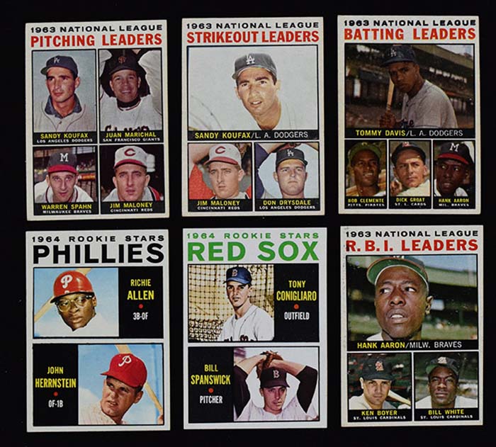Description:Lot of (176) 1964 Topps Baseball low numbers (GD-NM/MT). Highlights include #s 3 NL Pitching Leaders (VG/EX), 5 NL Strikeout Leaders (VG/EX), 7 NL Batting Leaders (VG/EX), 11 NL RBI Leaders (VG/EX-EX print defect), 40 Groat (VG/EX), 243 Allen rookie (EX/MT), 287 Conigliaro rookie (EX/MT-NM). Remainder are mostly commons, with some minor/regional stars and a few team cards mixed in. Various conditions throughout the lot. Most appear to average EX-EX/MT overall. (also includes two 1963 Topps commons). Range: GD-NM/MT