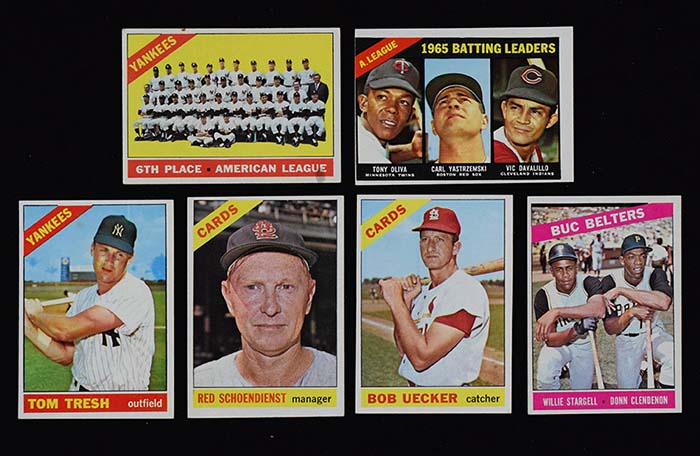 Description:Lot of (165) 1966 Topps Baseball cards (GD-NM/MT). Highlights include #s 91 Bob Uecker NO trade statement (EX/MT oc), 92 Yankees team (VG), 99 Stargell/Clendenon (EX oc), 216 AL Batting Leaders (VG/EX miscut). Remainder are mostly commons, with some minor/regional stars and a few team cards mixed in. Various conditions throughout the lot. Most appear to average EX-EX/MT overall. Range: GD-NM/MT
