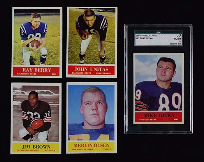 Description:Lot of (10) HOFers 1964 Philadelphia Football cards including graded Ditka (VG-NM/MT). Includes #s 1 Berry (EX/MT), 4 Gino Marchetti (VG), 12 Unitas (EX/MT), 17 Mike Ditka (SGC 80 EX/NM), 30 Jim Brown (VG/EX-EX), 66 Joe Schmidt (EX/MT), 75 Henry Jordan (EX/MT oc), 91 Merlin Olsen (EX/MT), 114 Roosevelt Brown (NM-NM/MT), and 161 Johnson (VG). Range: VG-NM/MT