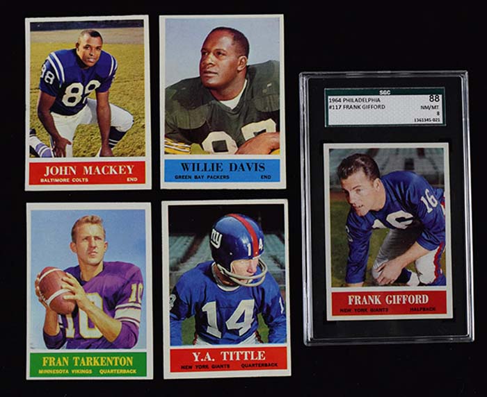 Description:Lot of (10) HOFers 1964 Philadelphia Football cards including graded Gifford (VG-NM/MT). Includes #s 3 John Mackey (VG), 8 Jim Parker (VG-VG/EX), 15 Doug Atkins (VG/EX), 62 Yale Lary (EX/MT), 72 Willie Davis (EX/MT-NM), 80 Jim Taylor (EX oc), 109 Fran Tarkenton (EX/MT-NM), 117 Frank Gifford (SGC 88 NM/MT), 124 Y.A. Tittle (VG/EX), and 185 Sam Huff (VG). Range: VG-NM/MT