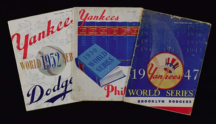 Description:1947, 1950, and 1952 World Series programs (VG-EX/MT). Includes 1947 World Series program from game played at Yankee Stadium (VG, unscored); 1950 World Series program from game played at Yankee Stadium (VG, unscored); and 1952 World Series program from game played at Yankee Stadium (EX-EX/MT, unscored). Range: VG-EX/MT