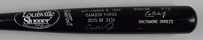 Description:Cal Ripken Jr. signed limited edition baseball bat (NM). 35" Louisville Slugger P72 Cal Ripken Jr model bat stamped "September 6, 1995" "Camden Yards" "2015 of 2131". Ripken signed the bat in silver marker. Signature rates 8/9 out of 10: NM