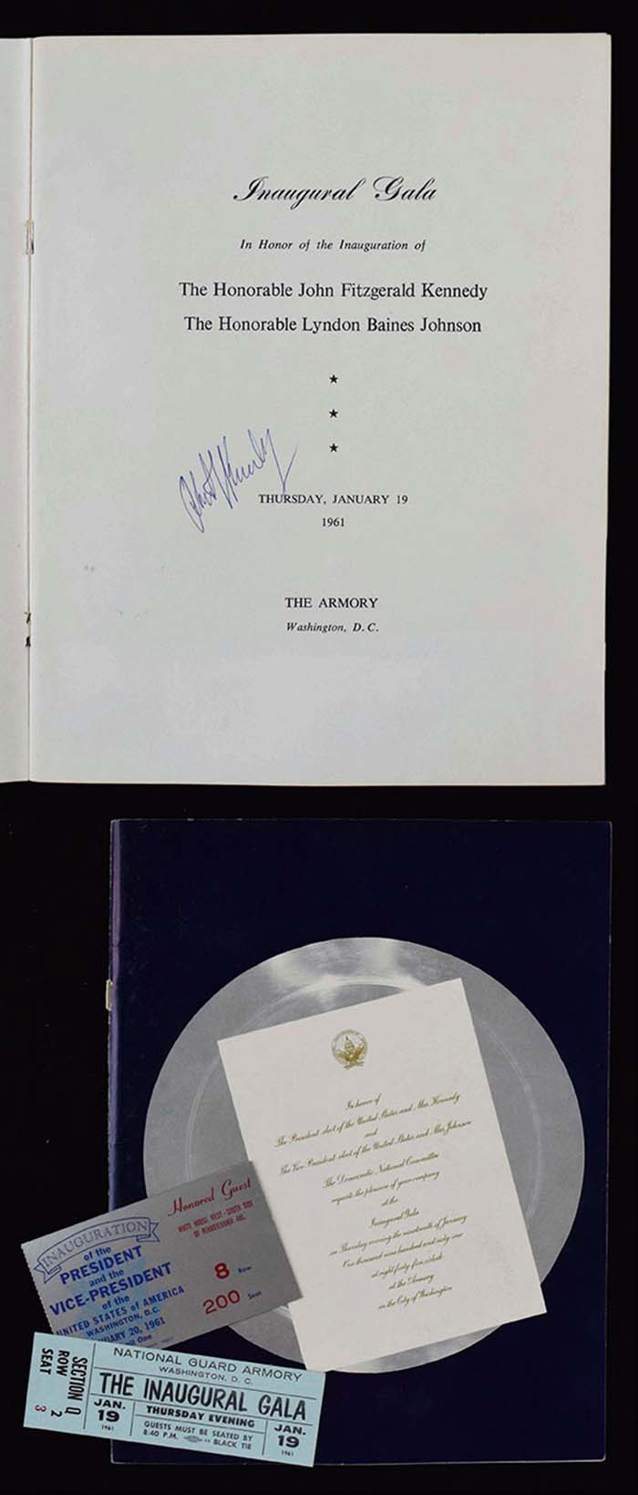 Description:Robert F. Kennedy signed 1961 John F. Kennedy and Lyndon Johnson Inauguration program (with related ticket/stub) (Sig. NM, Program EX-EX/MT) Original program issued for the January 20, 1961 Inauguration of Kennedy and Johnson has been signed on the first inside page by Bobby Kennedy in ink rating 8-8/9 out of 10. Touch of light handling wear to exterior which is generally clean. Includes a ticket stub to the Inauguration (EX/MT) and a ticket (possibly full) to the Inaugural Gala (EX/MT): Sig. NM, Program EX-EX/MT ($400-$600)