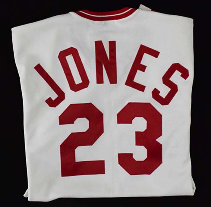 Description:1983 Jeff Jones Cincinnati Reds professional model home jersey (EX) White pullover jersey has Reds team logo and number "23" on front. Number also appears on back below the name, "Jones." Rawlings manufacturers tag on inside tail notes the size (44) and adjacent is an "Set 1 1983" flag tag. Usage and wash wear evident throughout: EX