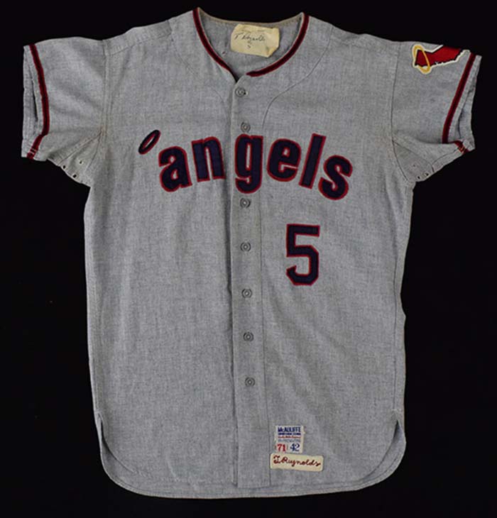 Description:1971 Tommie Reynolds California Angles professional model road jersey (EX) Gray flannel jersey with "Angles" lettered across the front has number "5" on back. Team logo patch appears on left sleeve. Tim McAuliffe tag is on front tail with adjacent "71" year and "42" size tags. "T.Reynolds" embroidered strip tag below. Small piece of vintage paper stapled into the collar notes player name aswell. Usage and wash wear evident throughout: EX
