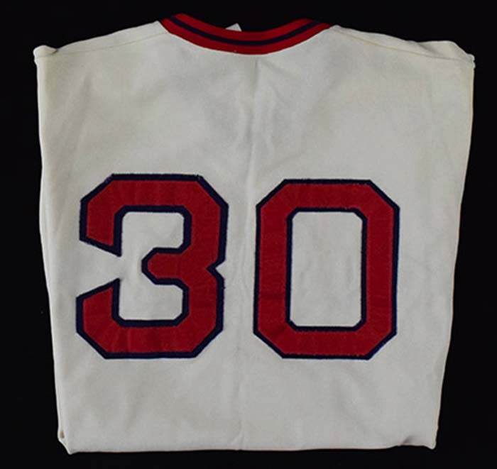 Description:1973 Boston Red Sox professional model home jersey (EX) White knit jersey with "Red Sox" lettered across the front has number "30" on back. Tim McAuliffe tag is on inside tail along with "1973" year and size "44" tags. There is also a wash tag. Evident usage and wash wear throughout with some slight off coloration and spotting. This jersey number was not issued to any player during the 73 season: EX