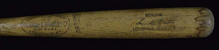 Description:Luke Easter professional model baseball bat c.1950s (VG-EX) Louisville Slugger 125 model R43 bat measures 35" long. Strong usage wear evident throughout with handle crack and chipping of knob. Barrel end has evidence of moisture damage. Vintage marker notation on knob appears to be the number "5": VG-EX