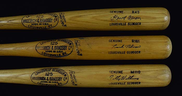 Description:Hank Aaron, Frank Robinson, and Billy Williams post-career professional model bats c.1977-79 (3) (EX) Trio of top quality bats includes model R43 with Aaron facsimile signature, R161 with Robinson, and M110 with Williams. Usage wear evident throughout with handle cracks to Williams and Robinson. Aaron has "44" written on knob in black marker: EX