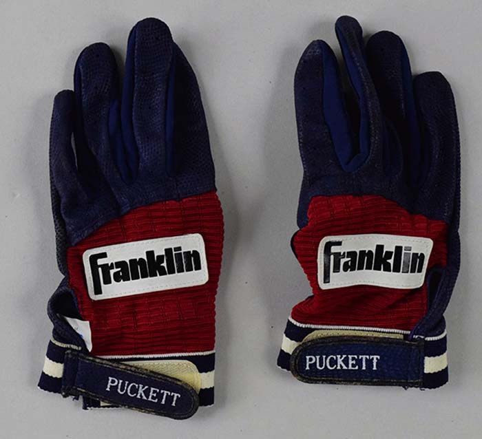 Description:Kirby Puckett professional model batting gloves (EX) Pair of Franklin brand red and blue batting gloves each have "Puckett" block lettered on wrist strap. Usage wear evident throughout: EX
