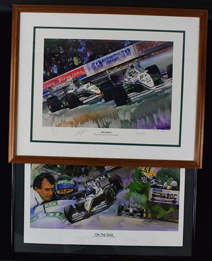 Description:Lot of (3) Team KOOL autographed limited edition prints incl. (1) signed by Tracy and Franchitti (EX/MT-NM) Trio of nicely done prints done by Ken Call, each framed for display. Includes 1996 release numbered out of (500) and signed by Barry Green, Greg Ray, and Chris Simmons; 1997 release numbered out of (2,100) and signed by Barry Green, Parker Johnstone, and Kin Green; and 1998 release numbered out of (2,000) and signed by Barry Green, Kim Green, Paul Tracy, and Dario Franchitti. Each is nicely framed for display (all around 27"x33.5") with light wear to frames. One frame has some heavier wear and the print is loose behind matting: EX/MT-NM
