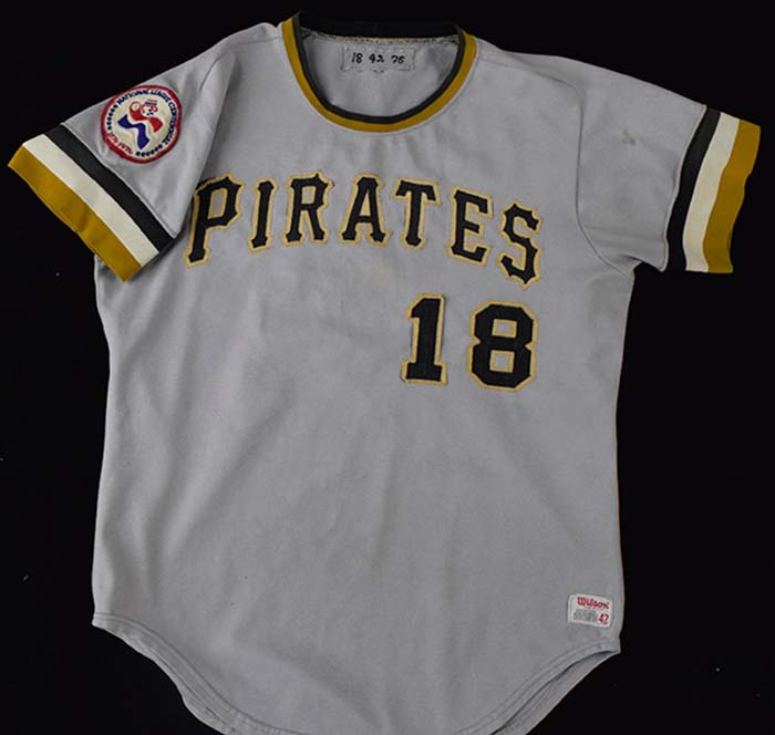Description:1976 Pittsburgh Pirates professional quality road jersey (VG-EX) Gray knit pullover jersey has "Pirates" lettered across the front with number "18" below. Number also appears on the back. There is a vintage 1976 Centennial patch on right sleeve however it appears that the Pirates typically wore them on the other arm. An embroidered strip tag in collar reads, "18 42 76" and there is a Wilson tag on front tail noting size (42). Exceptionally strong usage wear evident throughout with a team repair and some separation to sewn on letters/numbers: VG-EX