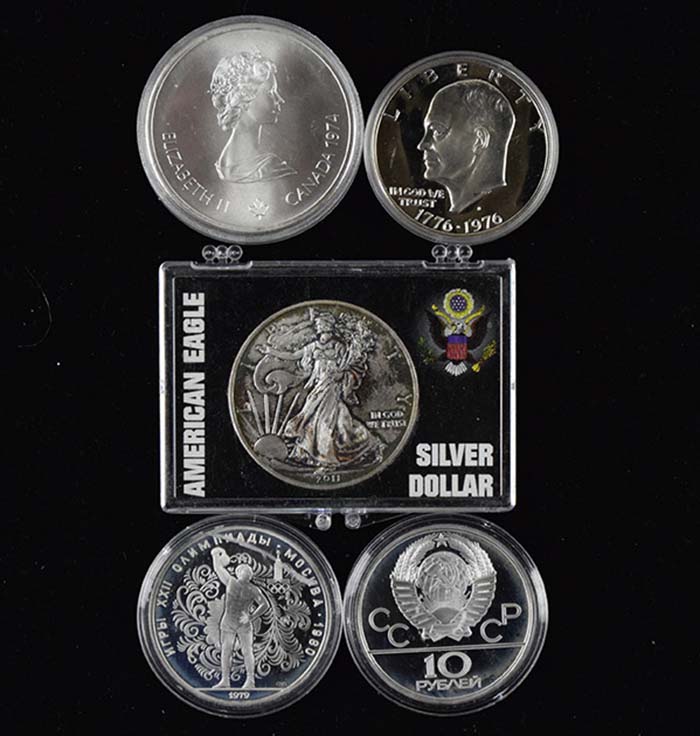 Description:Lot of (5) silver coins from 1976-2011 (EX-MT). Includes 1976 Olympics 10-dollar silver coin (NM/MT), 1976 Eisenhower Silver Dollar (NM/MT), (2) different 1980 Olympics silver coins (NM-MT), and 2011 American Eagle Silver Dollar (EX toned). Range: EX-MT