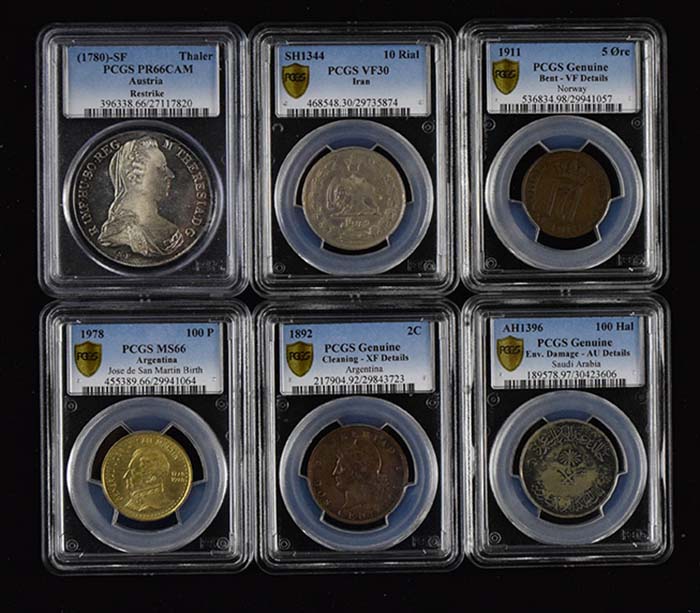 Lot of (9) PCGS graded foreign coins (Genuine-PR66CAM). Includes AH1396 Saudi Arabia 100 Hal coin (Genuine - Env. Damage - AU Details); SH1344 Iran 10 Rial coin (VF30); 1780-SF Austria Thaler Restrike coin (PR66CAM); 1829 Portugal 40 R coin (Genuine); 1892 Argentina 2 C coin (Genuine - Cleaning - XF Details); 1911 Norway 5 Ore coin (Genuine - Bent - VF Details); 1922 Norway 5 Ore coin (VF35); 1925 Portugal 10 C coin (Genuine - Env. Damage - F Details); and 1978 Argentina 100 P coin (MS66).