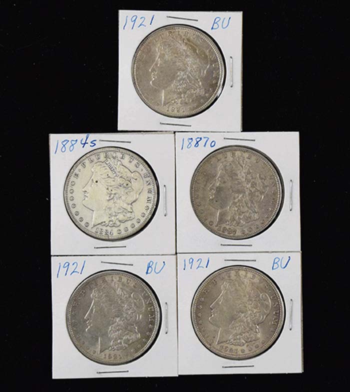 Description:Lot of (5) Morgan Silver Dollars from 1884-1921 (EX/MT-NM/MT). Years include 1884-S (EX/MT), 1887-O (EX/MT), and (3) 1921 (NM-NM-NM/MT). Range: EX/MT-NM/MT