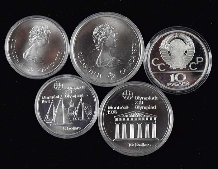 Lot of (5) Olympics commemorative silver coins (NM-MT). Includes (2) different 1976 Olympics 10-dollar coins weighing approx. 1.5-oz each, (2) different 1976 Olympics 5-dollar coins weighing approx. 1-oz each, and 1980 Olympics coin weighing approx. 1-oz: NM-MT