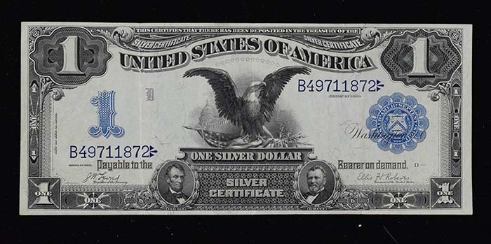 1899 Black Eagle $1 silver certificate (VG/EX). Retains a vibrant appearance, with only minor corner wear, and three vertical fold creases: VG/EX