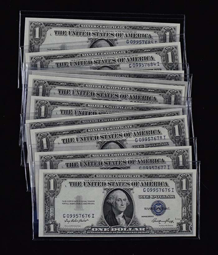 Lot of (10) uncirculated 1935-E $1 silver certificates (NM-NM/MT). All remain in crisp condition, and are consecutively numbered: NM-NM/MT