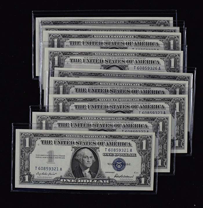Lot of (9) uncirculated 1957 blue seal $1 silver certificates (NM/MT). All remain in crisp condition, and are consecutively numbered: NM/MT