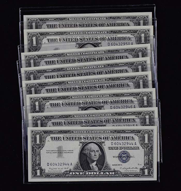 Lot of (8) uncirculated 1957-A $1 silver certificates (NM/MT). All remain in crisp condition, and are consecutively numbered: NM/MT