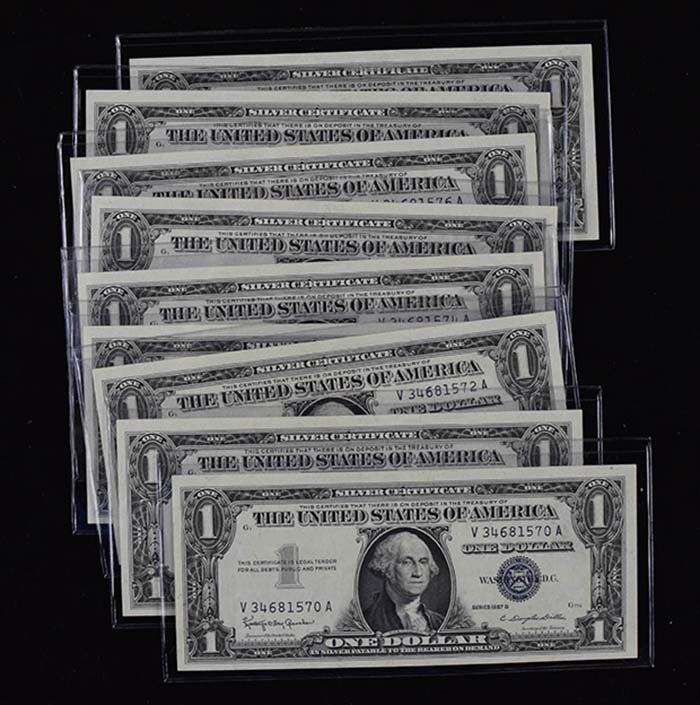 Lot of (9) uncirculated 1957-B $1 silver certificates (NM/MT). All remain in crisp condition, and are consecutively numbered: NM/MT