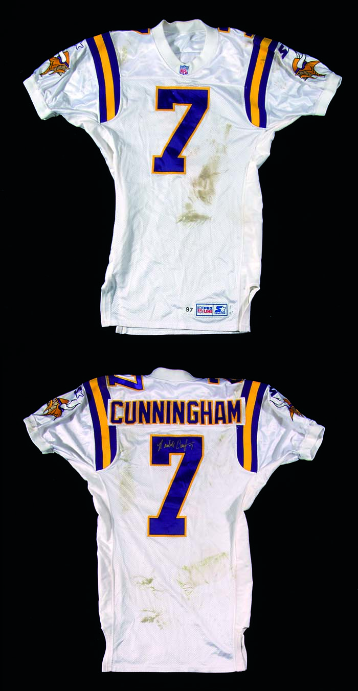 Description:1997 Randall Cunningham Minnesota Vikings game worn road jersey (Cunningham letter of provenance) (EX) White knit and mesh jersey retains "Cunningham" nameplate on back with uniform #7 on front, back, and both shoulders. Proper Starter Pro Line tagging affixed to tail front along with "97" year tag. Jersey shows tremendous use with grass staining, impact markings, and soiling on front. Superb game jersey dating to Cunningham's return to NFL football with the Minnesota Vikings en route to an MVP season in 1998. Signed in gold paint pen by Cunningham on the back. Includes LOA from Hunt Auctions (jersey), auction LOA from JSA (autograph), and letter of provenance from Cunningham: EX ($1,500-$2,000)