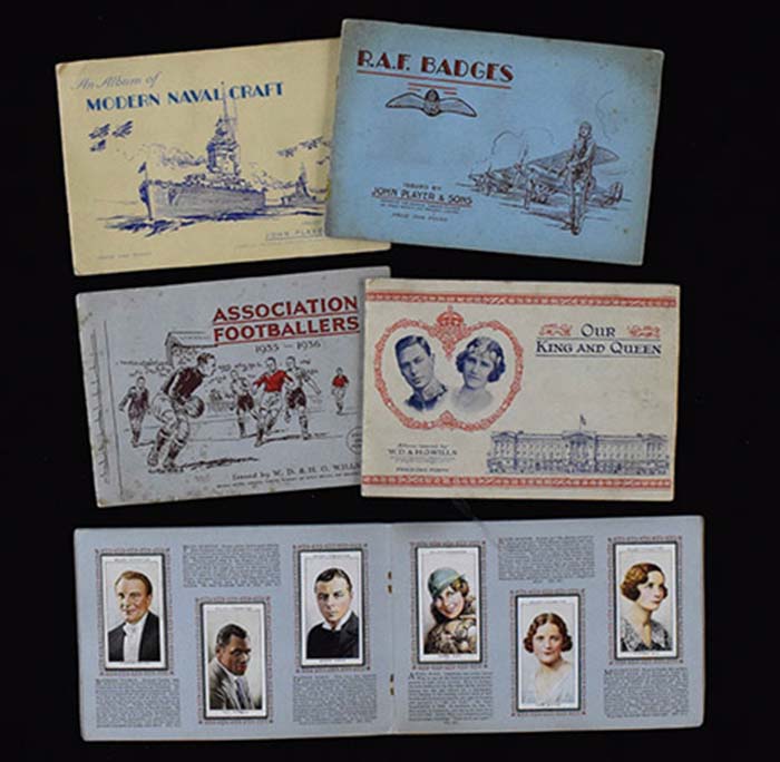 Description:Lot of (7) cigatette/tobacco card sets from 1934-1939 with original albums (see description). Includes 1934 Wills "Radio Celebrities" 50-card set, 1935-36 Wills "Association Footballers" 50-card set, (2) 1937 Wills "Our King And Queen" 50-card sets, 1937 Player "R.A.F. Badges" 50-card set, 1938 Player "Military Uniforms of the British Empire Overseas" 50-card set, and 1939 Player "Modern Naval Craft" 50-card set. All cards are affixed at their proper position within their oeiginal album. The albums have various degrees of age/handling wear, but most cards appear NM overall, with note to being affixed on the pages.